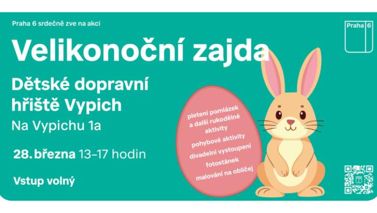 Městská část Praha 6 zve všechny děti a jejich rodiče na akci Velikonoční zajda, která se uskuteční v sobotu 28. března od 13:00 do 17:00 hodin na dětském dopravním hřišti na Vypichu. Těšit se můžete na pletení pomlázek a další rukodělné a pohybové aktivity, divadelní vystoupení, fotostánek či malování na obličej. Vstup na akci je zdarma. Přijďte, těšíme se na vás!