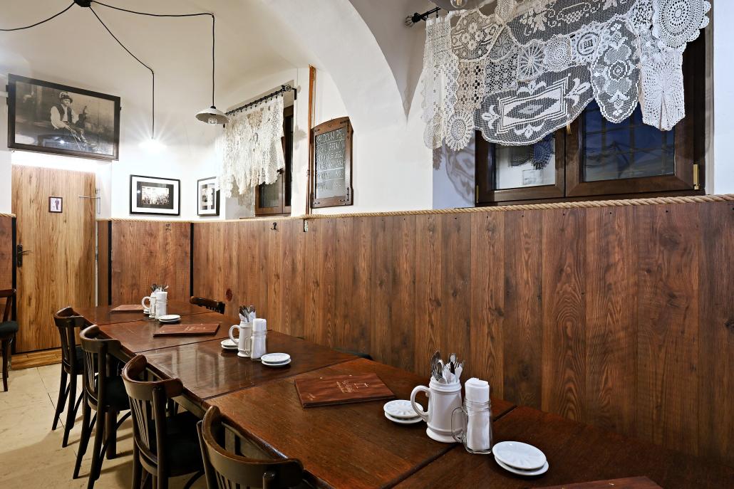 U Váhy se rozkládá ve třech patrech a každé má svou tvář. V přízemí je klasický český hostinec s dřevěnými stoly, starými fotografiemi na stěnách a pocitem, že se tu čas zpomaluje. V patře najdete klidnější salonek pro rodinné oslavy, soukromé degustace nebo komornější firemní večeře. A ve sklepě se skrývá „Zašívárna U Váhy“ – atmosférický prostor pro večerní posezení, menší akce a skupiny, které chtějí zažít Prahu trochu jinak.