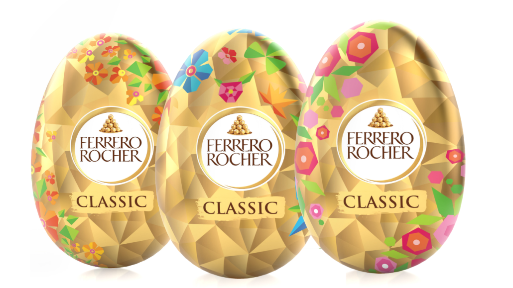 Letošní sezóna přináší novinku – velikonoční vejce Ferrero Rocher, dostupné v charakteristickém zlatém obalu, který doplňuje květinový motiv ve třech různých barevných kombinacích.